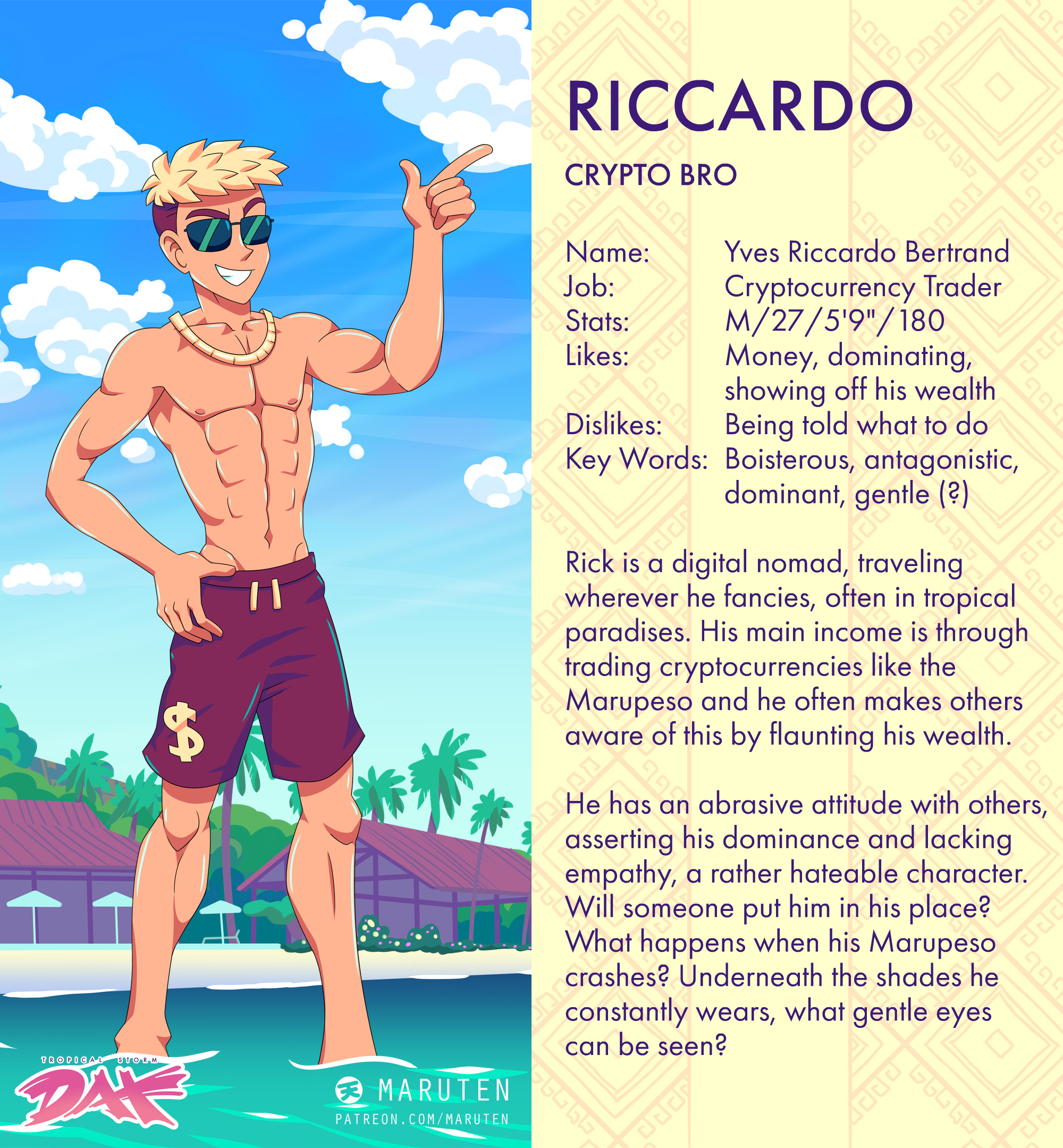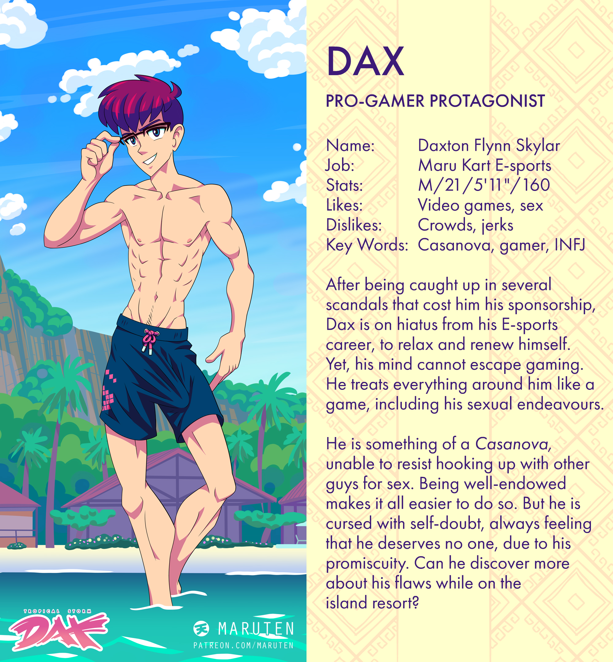 Tropical Storm Dax is an experimental BL animated story, made by Maruten with the help of Diamond Hard Patrons. By voting in polls, and by participating in suggestion boxes and round table discussions, Diamond Hard Patrons help decide the outcome of the story. There will be fully animated sex scenes, and supplemental story videos in the style of a visual novel. This dynamic project will evolve as it is being created. Become part of the creative process by becoming a Diamond Hard Patron at patreon.com/maruten!